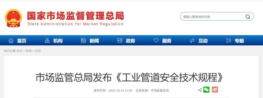 近日,市场监管总局根据《中华人民共和国特种设备安全法》规定,结合压力管道安全状况,整合修订《压力管道安全技术监察规程—工业管道》《压力管道定期检验规则—工业管道》等安全技术规范,发布新的《工业管道安全技术规程》(TSG 31—2025)。