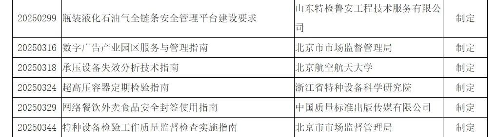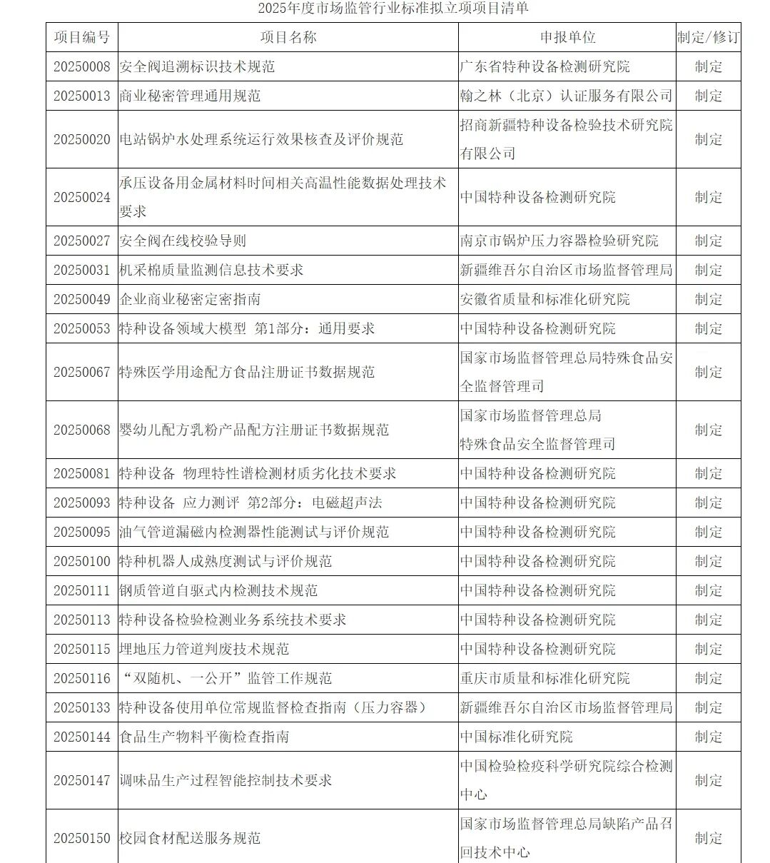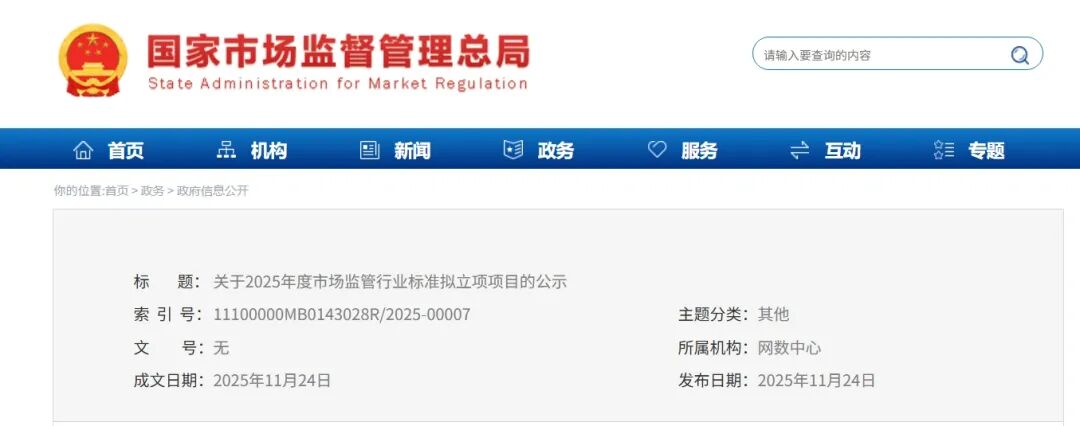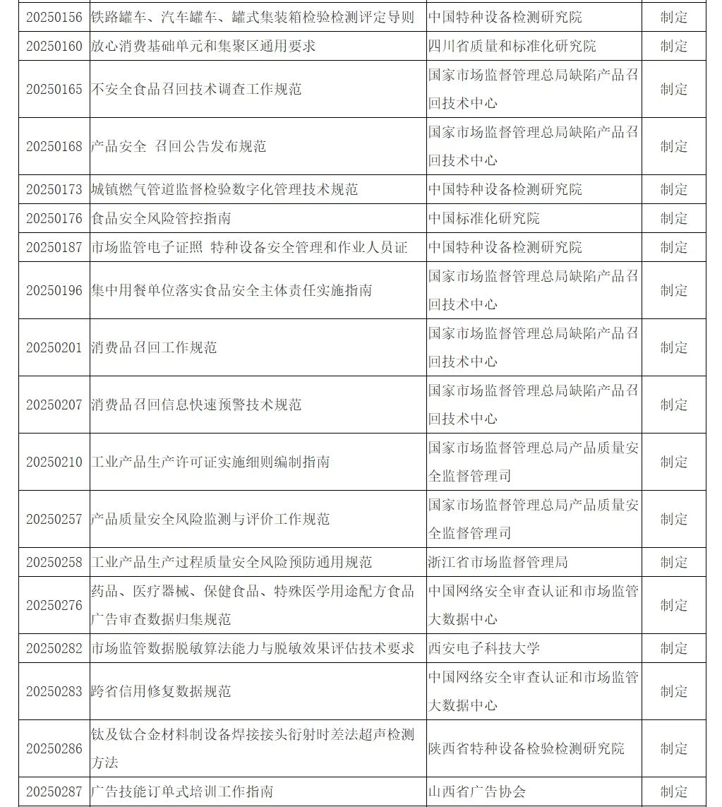 为深入贯彻落实《国家标准化发展纲要》,充分发挥标准化对市场监管业务的支撑保障作用,根据《市场监管行业标准管理办法》、《市场监管行业标准制定管理实施细则》(国市监办发〔2023〕36号)等有关规定,中国网络安全审查认证和市场监管大数据中心组织开展了2025年度市场监管行业标准制修订项目申报工作。经各单位申报、业务主管司局初审、专委会专家评审,拟对《安全阀追溯标识技术规范》等46项标准予以立项,现将标准项目名称、申报单位予以公示(名单见附件)。