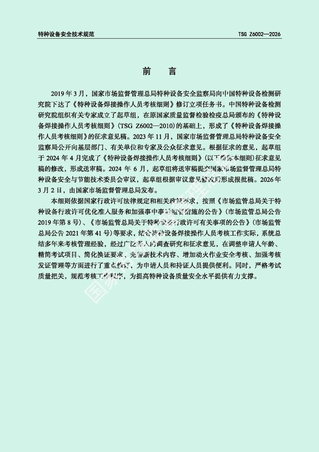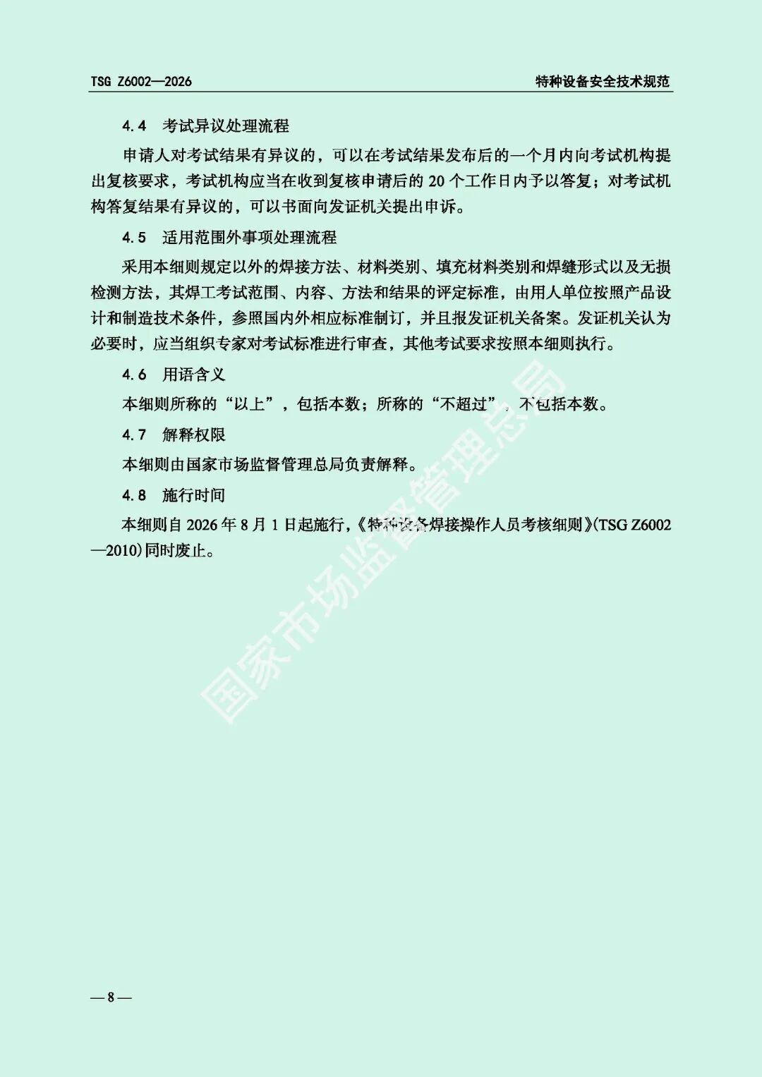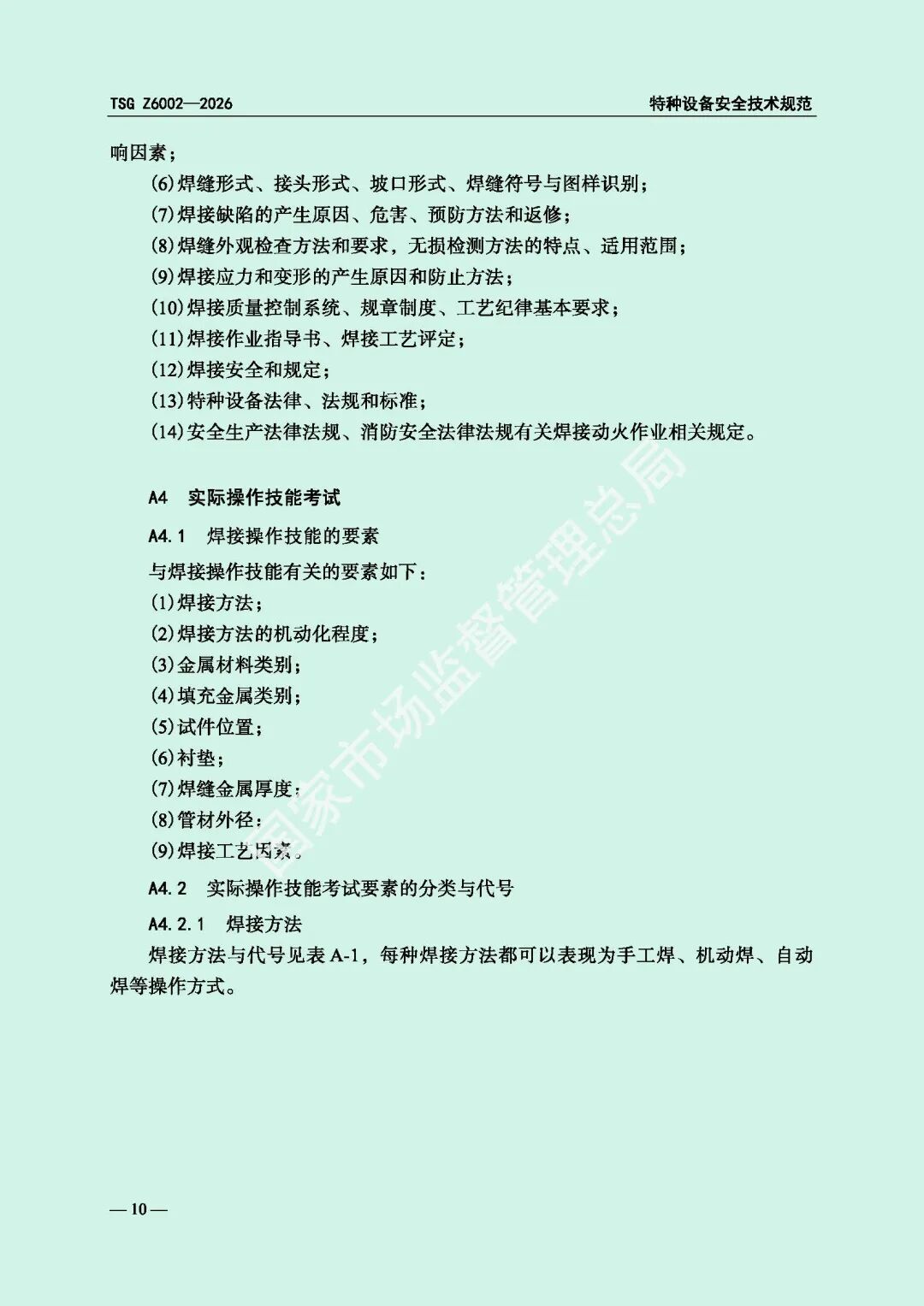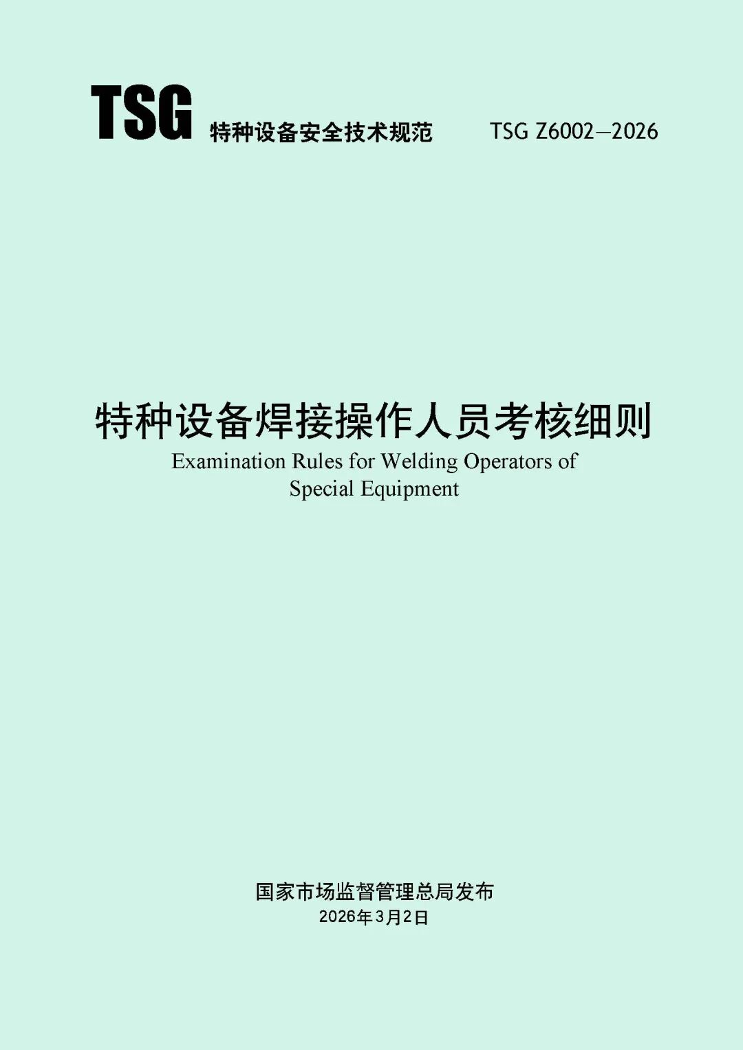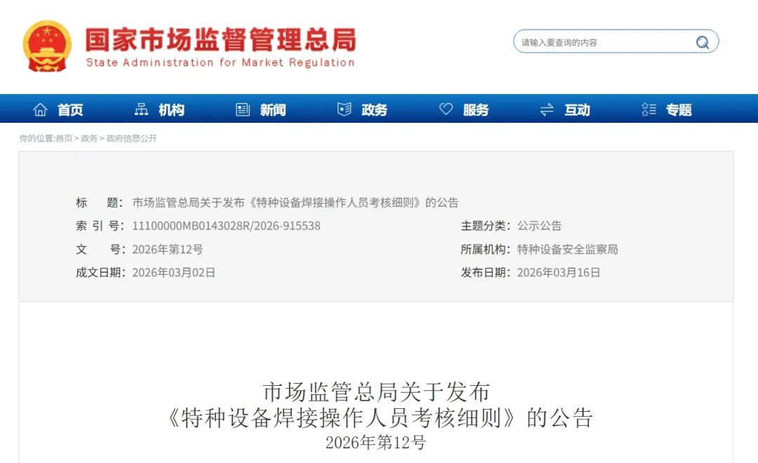 为进一步规范特种设备焊接操作人员考核工作,提高特种设备质量安全水平,市场监管总局对《特种设备焊接操作人员考核细则》(TSG Z6002-2010)进行了修订,现予以发布,自2026年8月1日起施行。