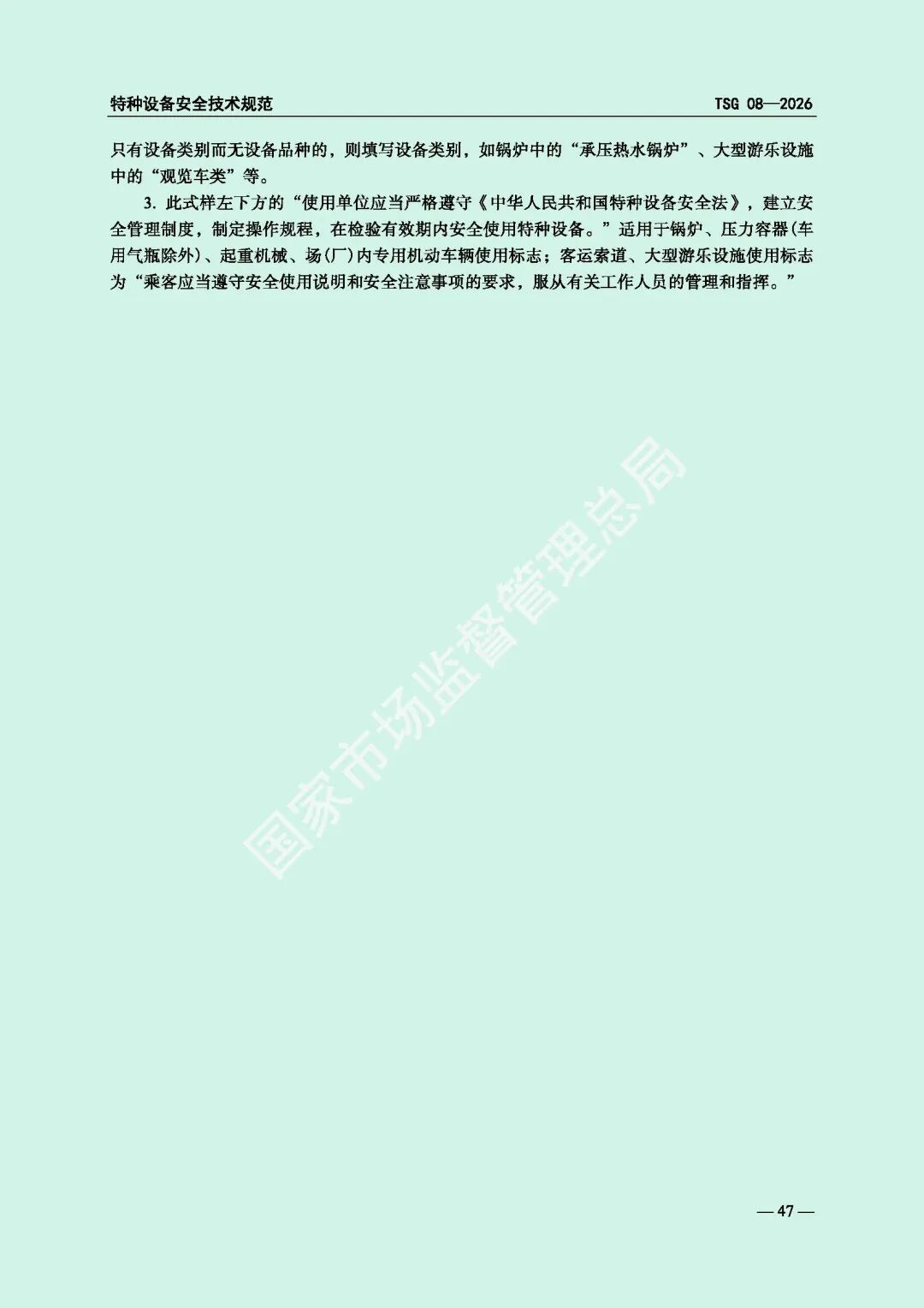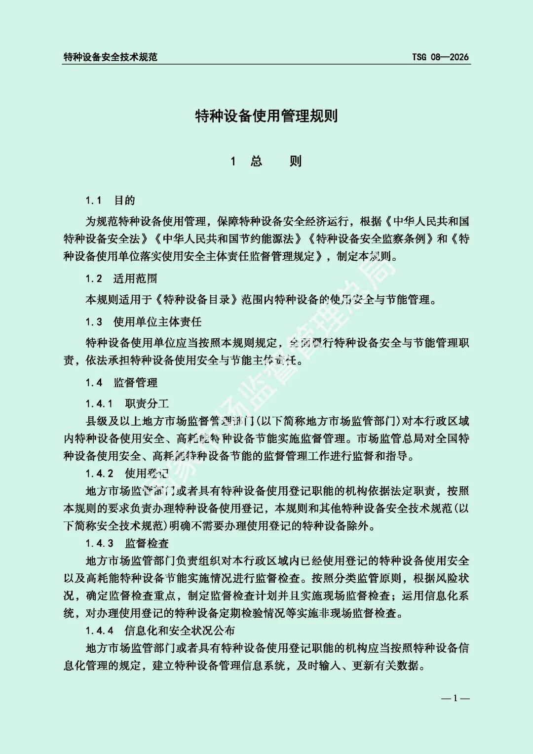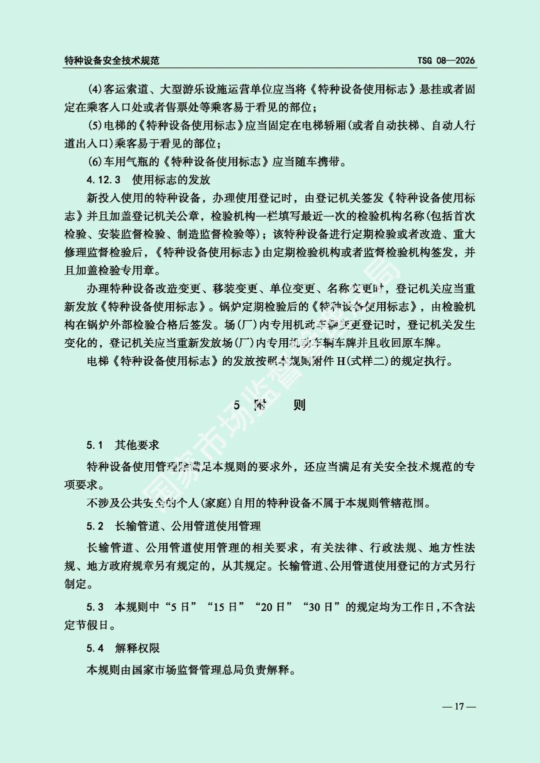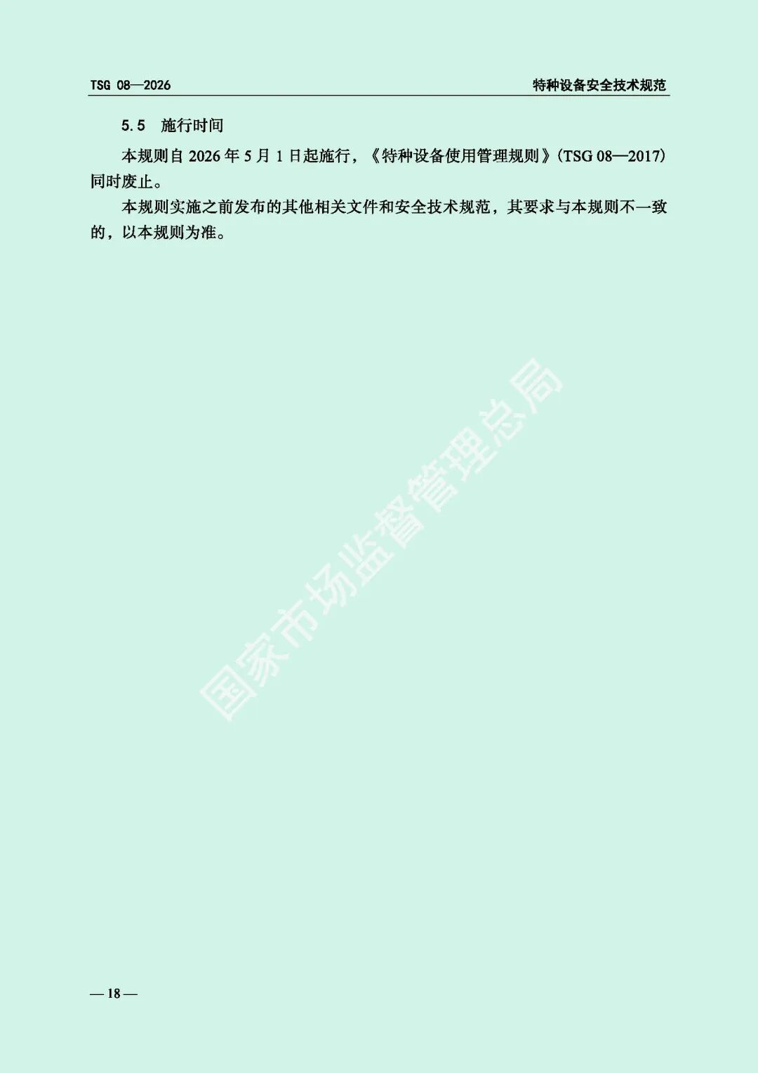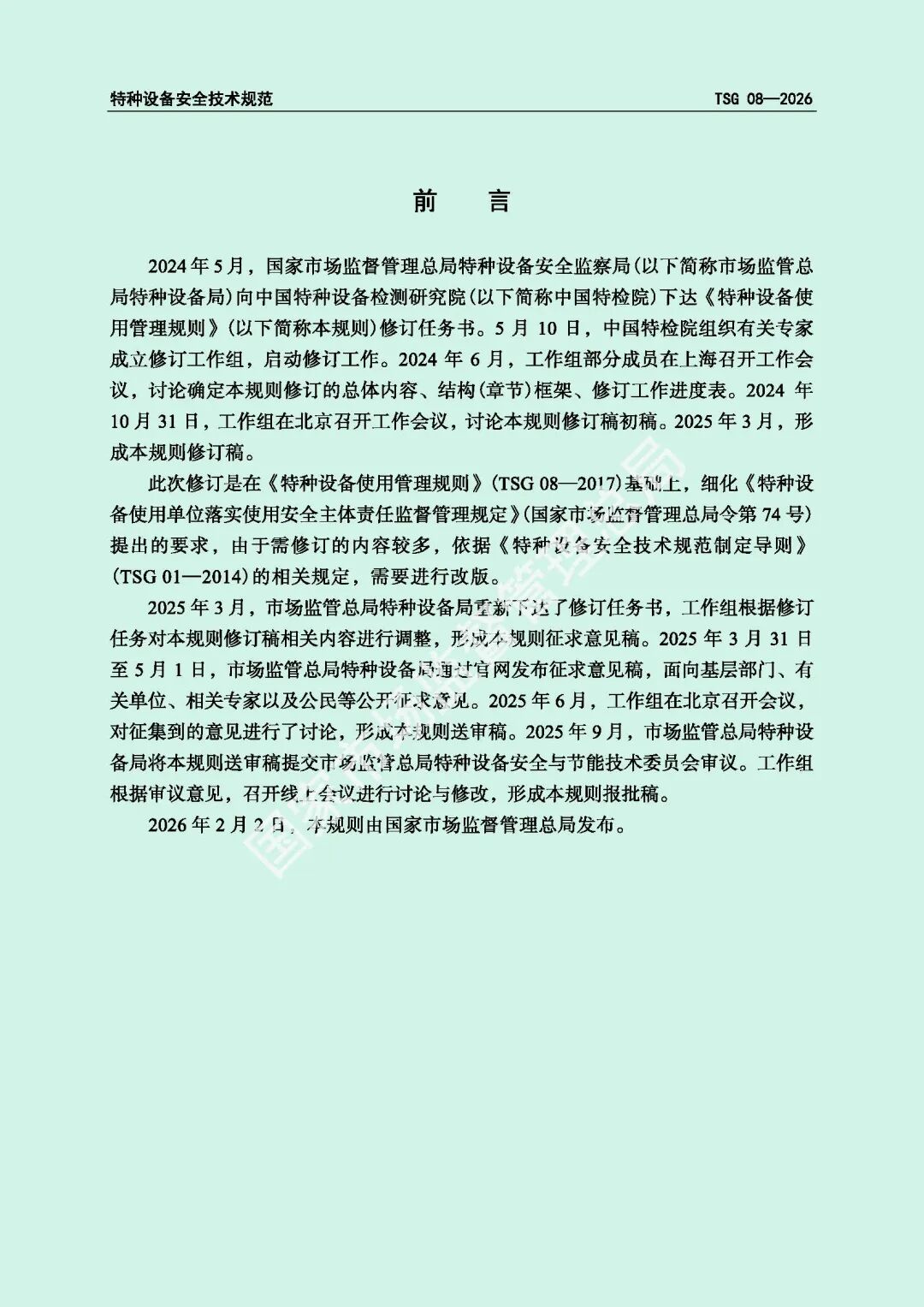 为贯彻落实《特种设备使用单位落实使用安全主体责任监督管理规定》(国家市场监督管理总局令第74号),进一步加强特种设备使用单位监管,市场监管总局对《特种设备使用管理规则》(TSG08-2017)进行了修订,现予以发布,自2026年5月1日起施行。