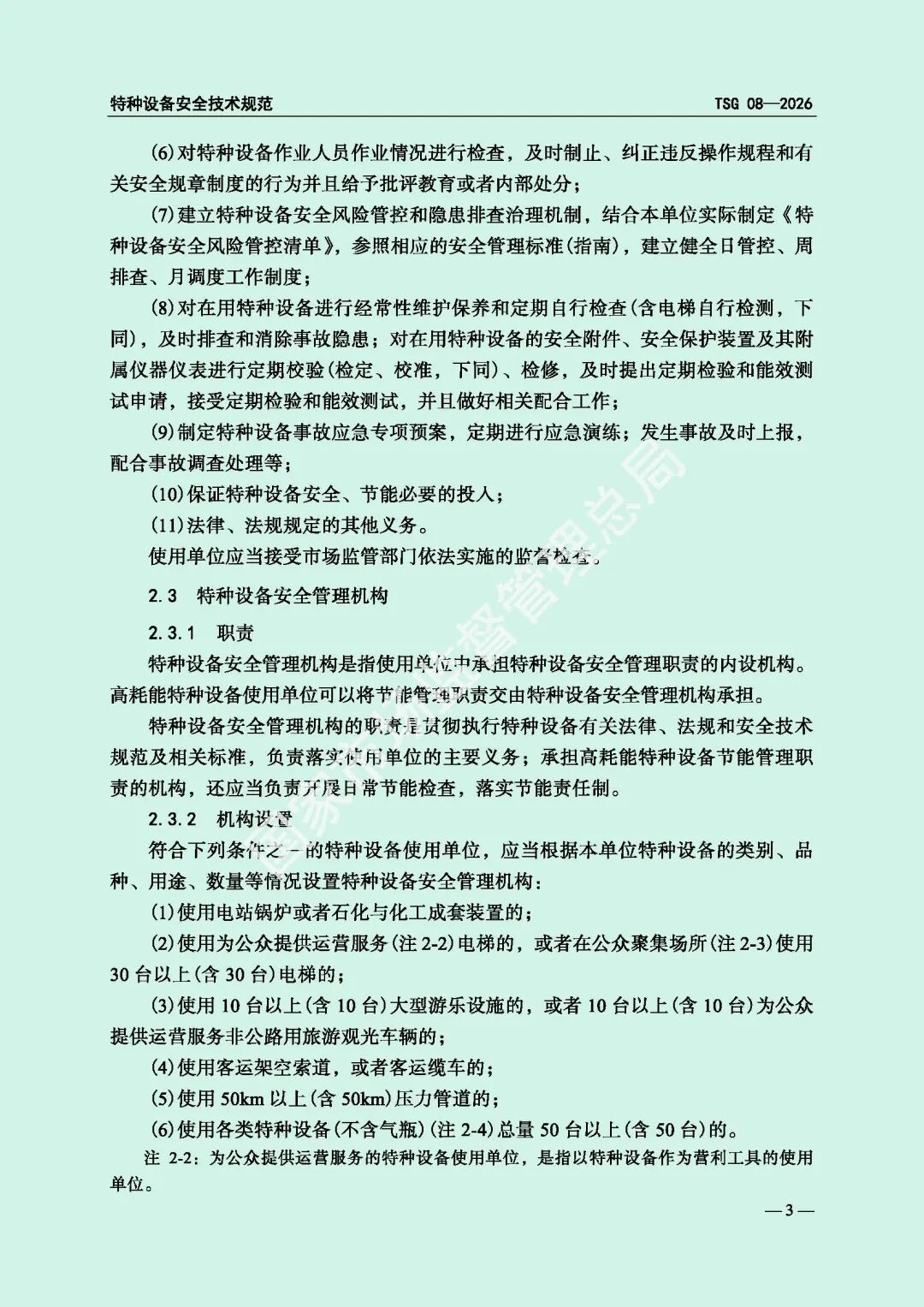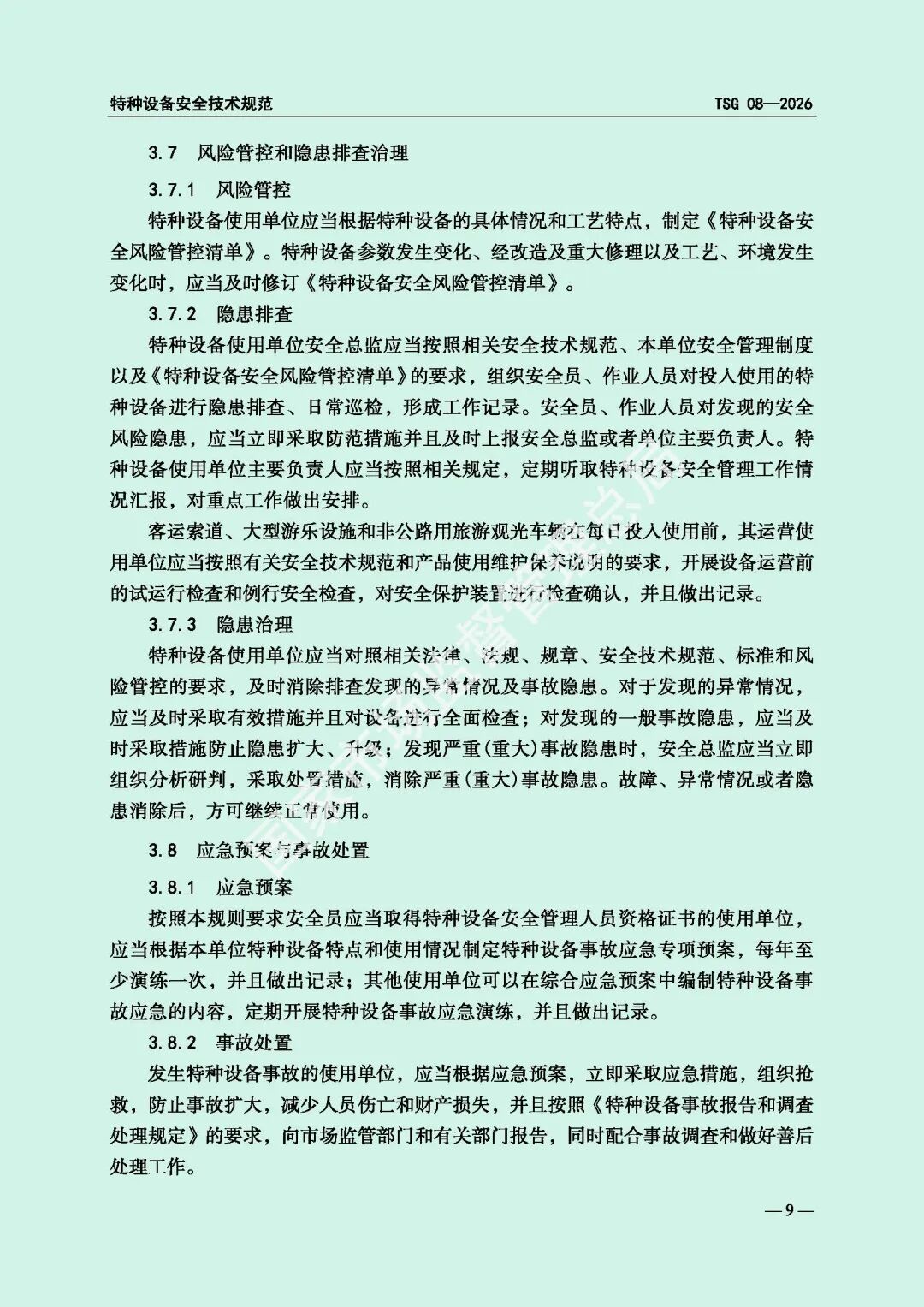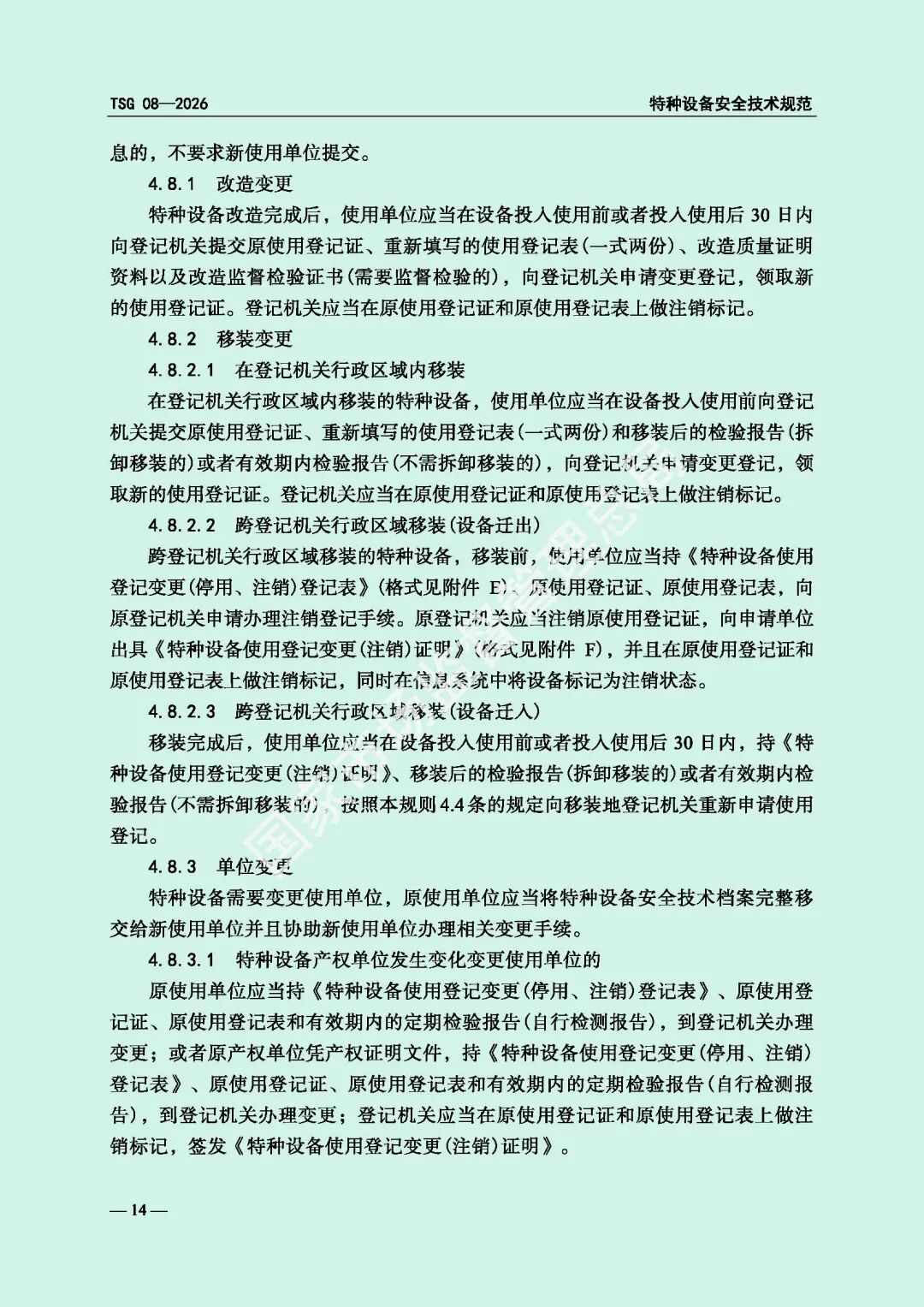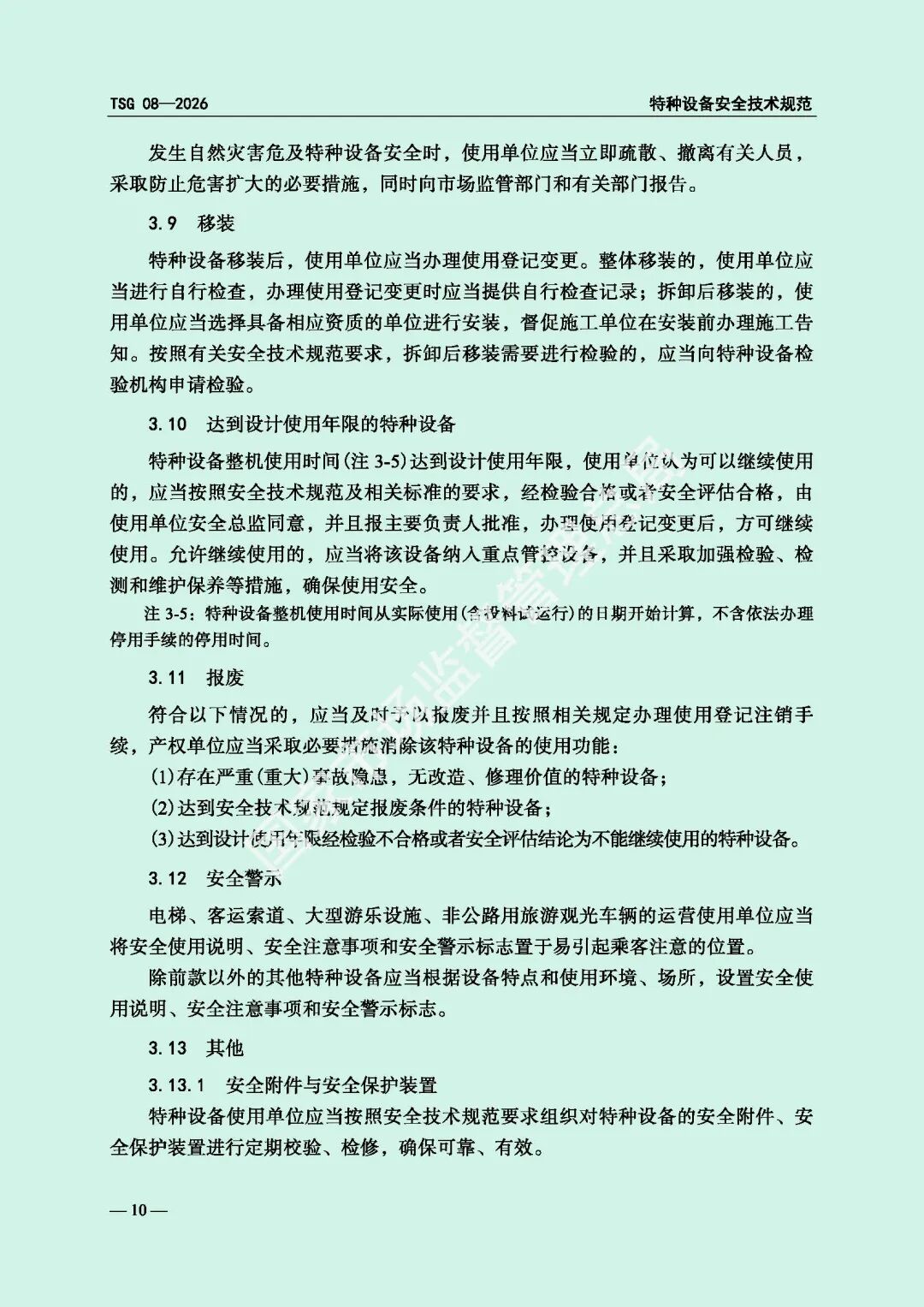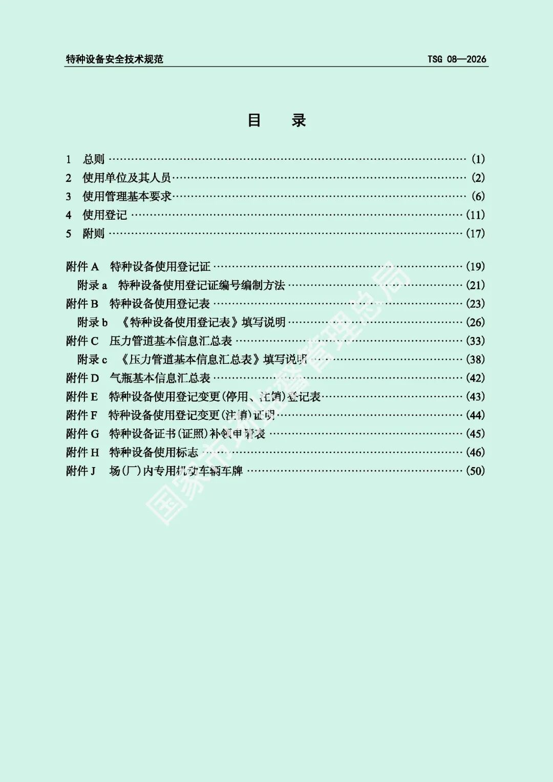 为贯彻落实《特种设备使用单位落实使用安全主体责任监督管理规定》(国家市场监督管理总局令第74号),进一步加强特种设备使用单位监管,市场监管总局对《特种设备使用管理规则》(TSG08-2017)进行了修订,现予以发布,自2026年5月1日起施行。