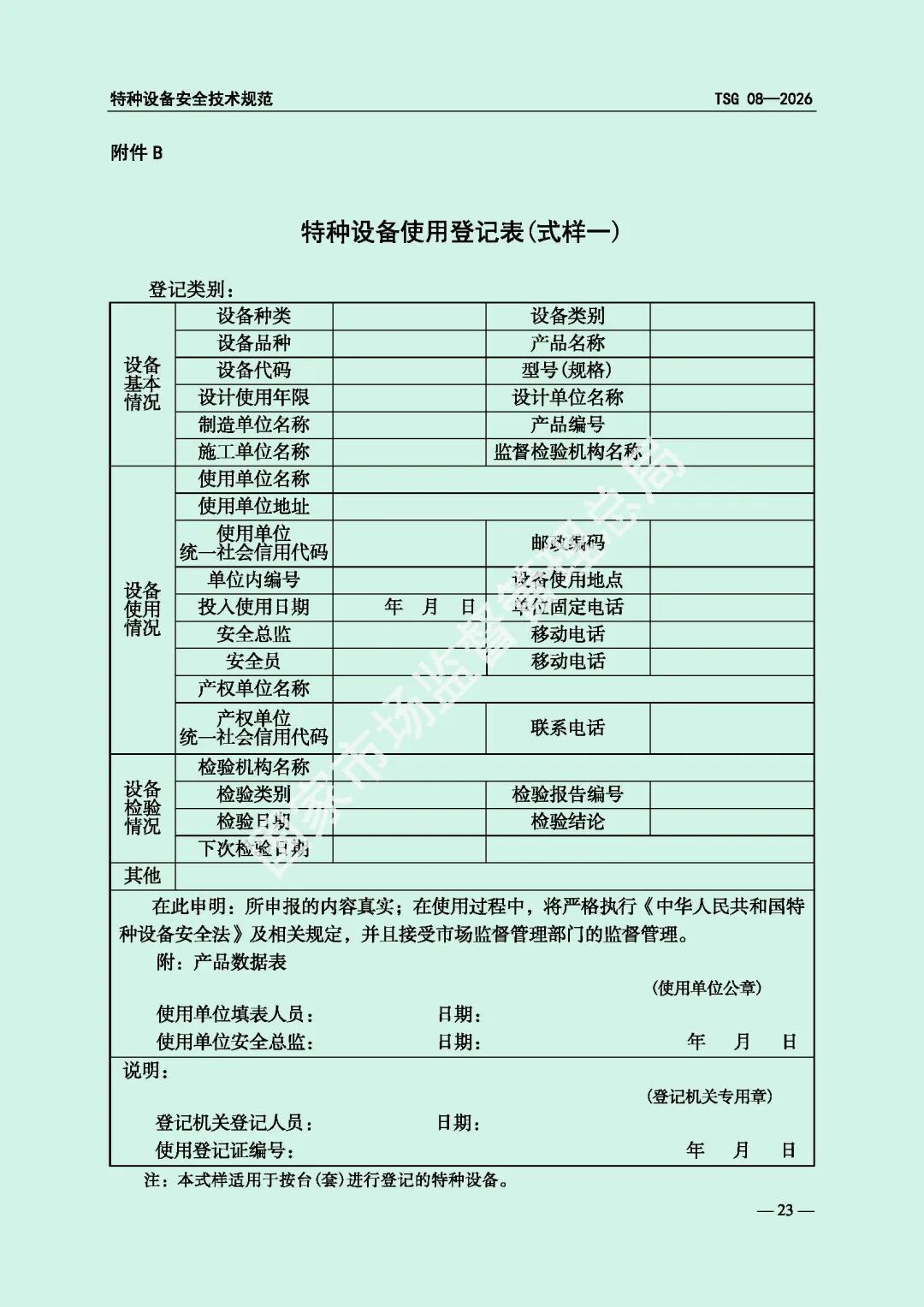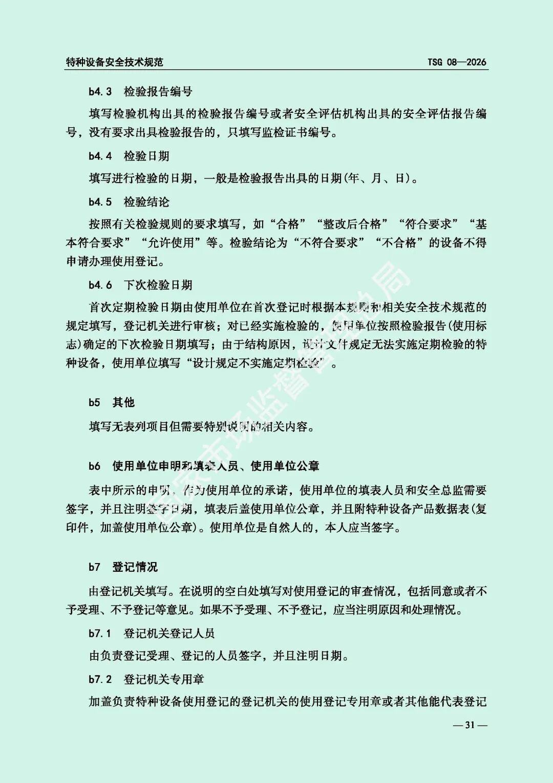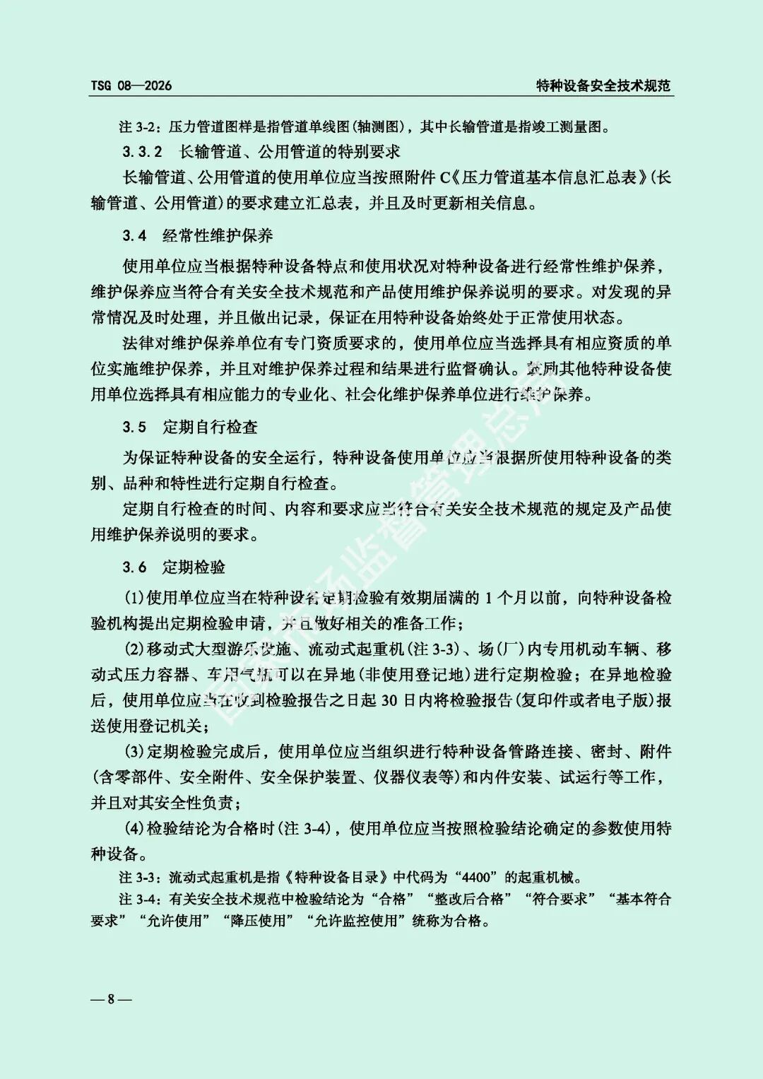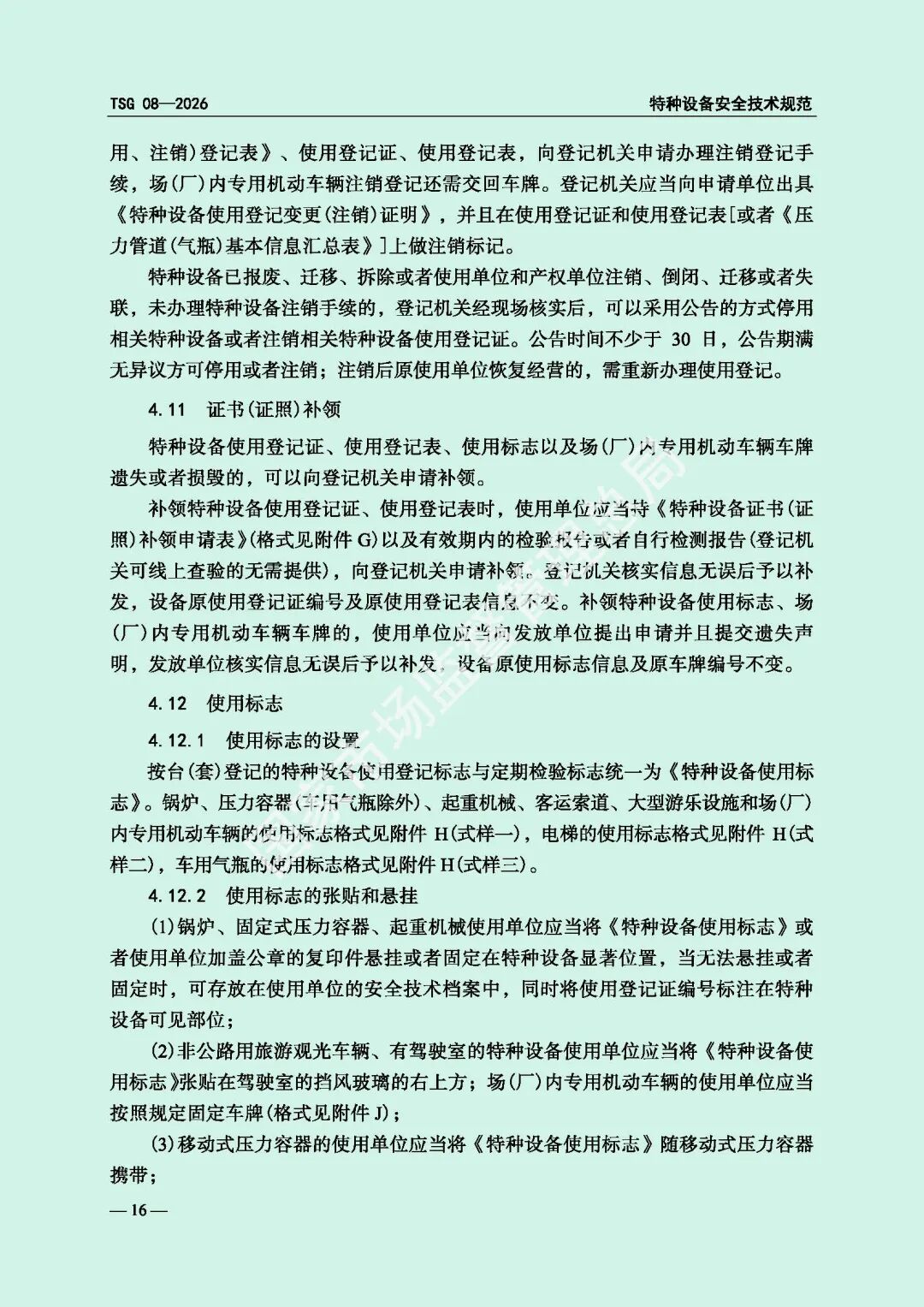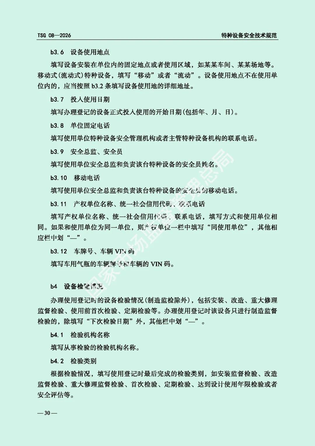 为贯彻落实《特种设备使用单位落实使用安全主体责任监督管理规定》(国家市场监督管理总局令第74号),进一步加强特种设备使用单位监管,市场监管总局对《特种设备使用管理规则》(TSG08-2017)进行了修订,现予以发布,自2026年5月1日起施行。