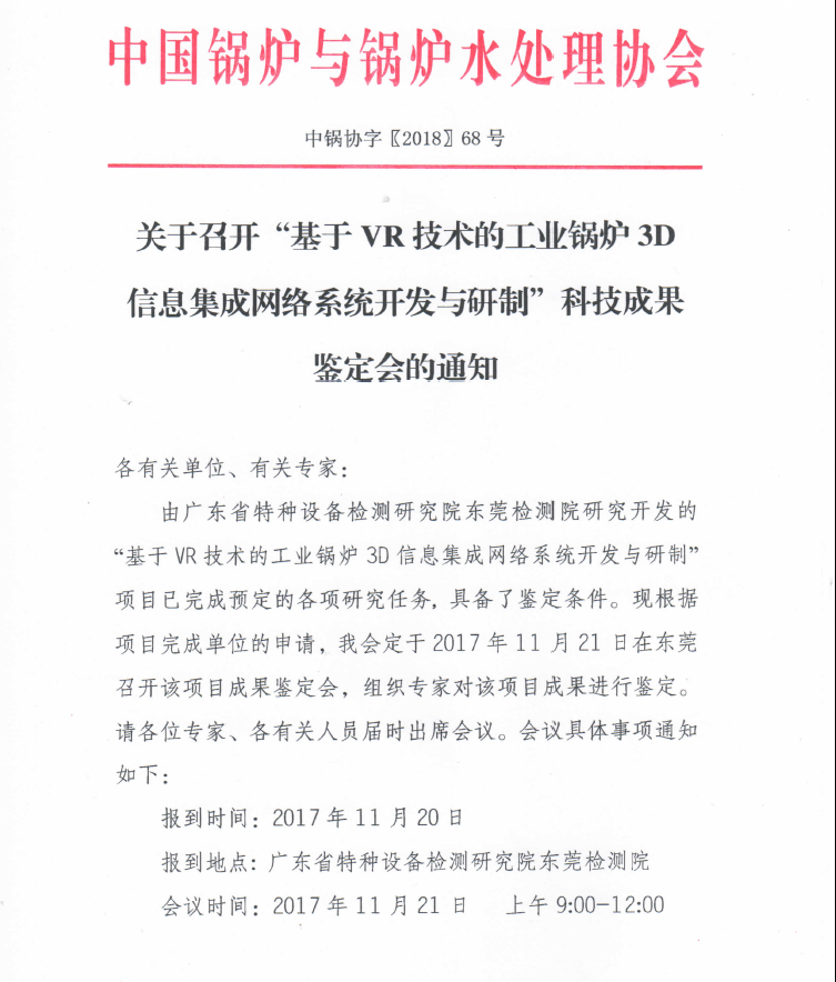 关于召开基于VR技术的工业锅炉3D信息集成网络系统开发与研制科技成果鉴定会的通知