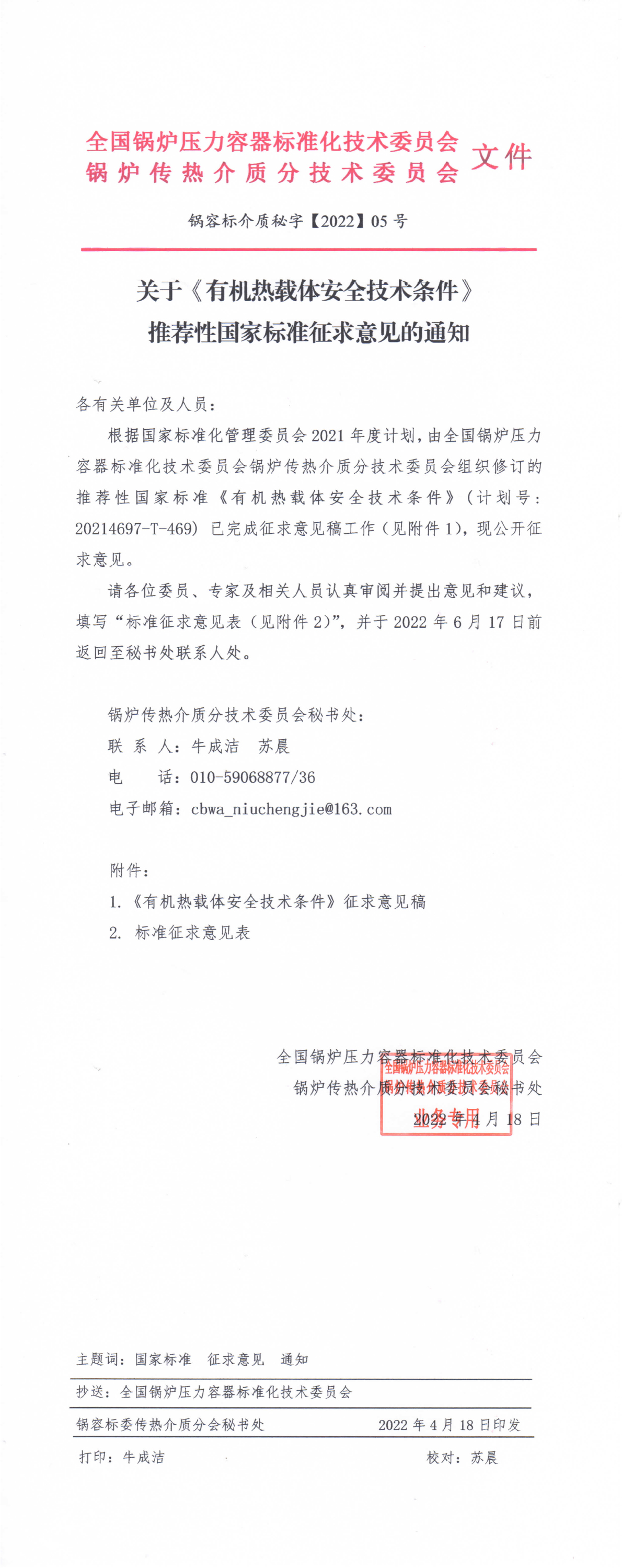关于《有机热载体安全技术条件》推荐性国家标准征求意见的通知