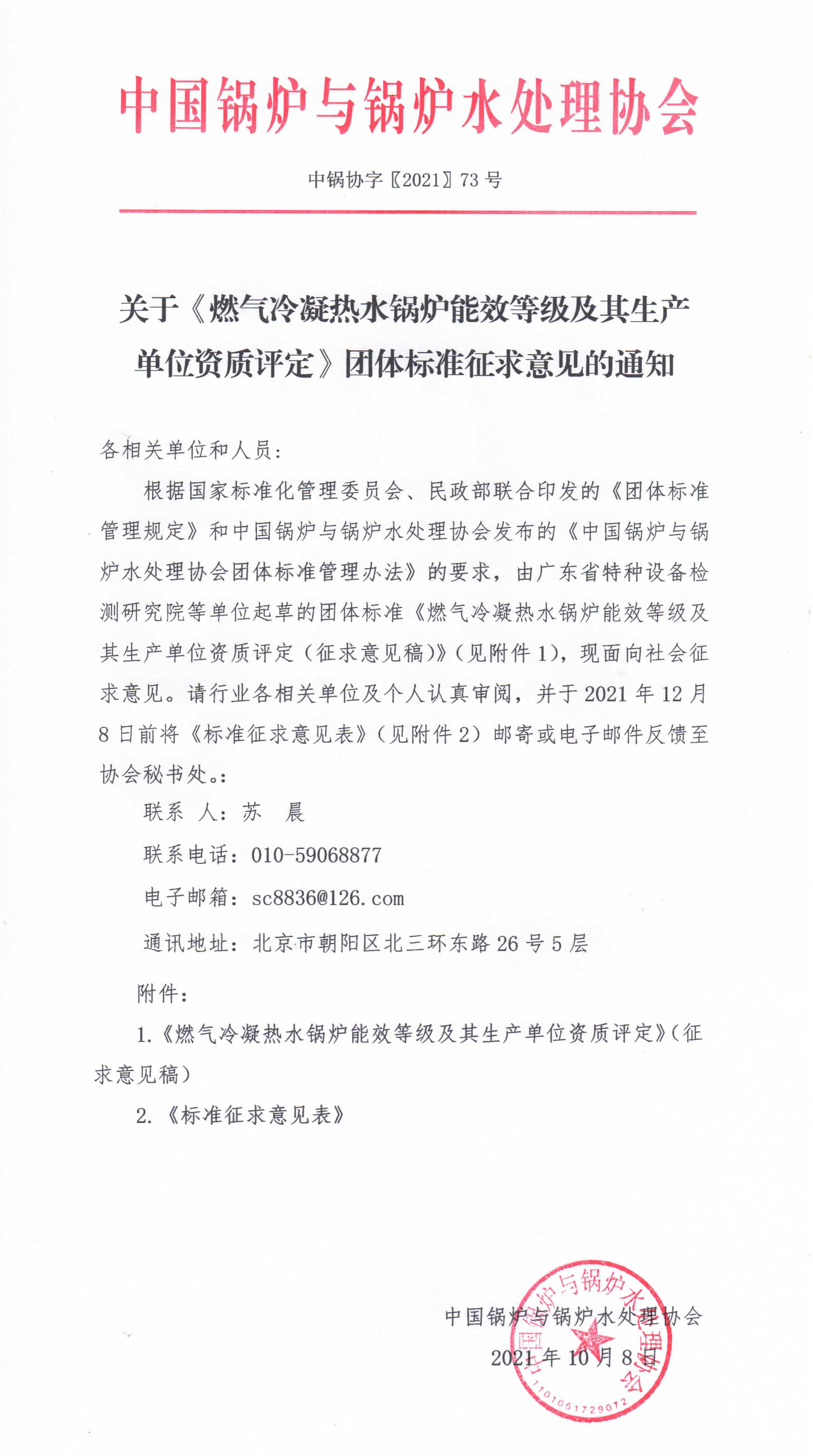 关于《燃气冷凝热水锅炉能效等级及其生产单位资质评定》团体标准征求意见的通知