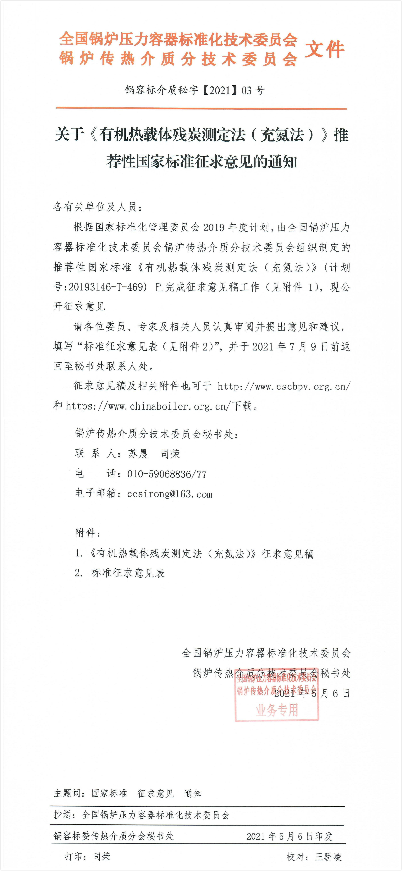关于《有机热载体残炭测定法(充氮法》推荐性国家标准征求意见通知