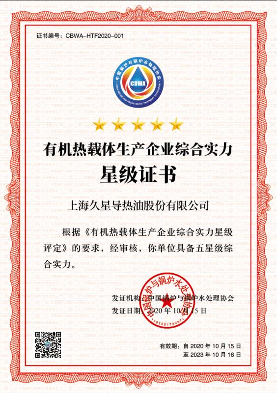 应上海久星导热油股份有限公司申请,2020年9月19-20日,中国锅炉与锅炉水处理协会派专家组,对有机热载体生产企业上海久星导热油股份有限公司进行了首次星级评定。专家组依据《标准》,针对企业的基础设施、资源、运行管理及产品和售后服务等多个方面,对企业进行了全面审查评定。经专家组评审,上海久星导热油股份有限公司达到了《标准》规定的五星级有机热载体生产企业综合实力要求,特颁发此星级证书。为强化星级评定的宣传引导作用,协会特授权通过星级评定的企业可在产品包装上标注协会徽标及对应的星级。